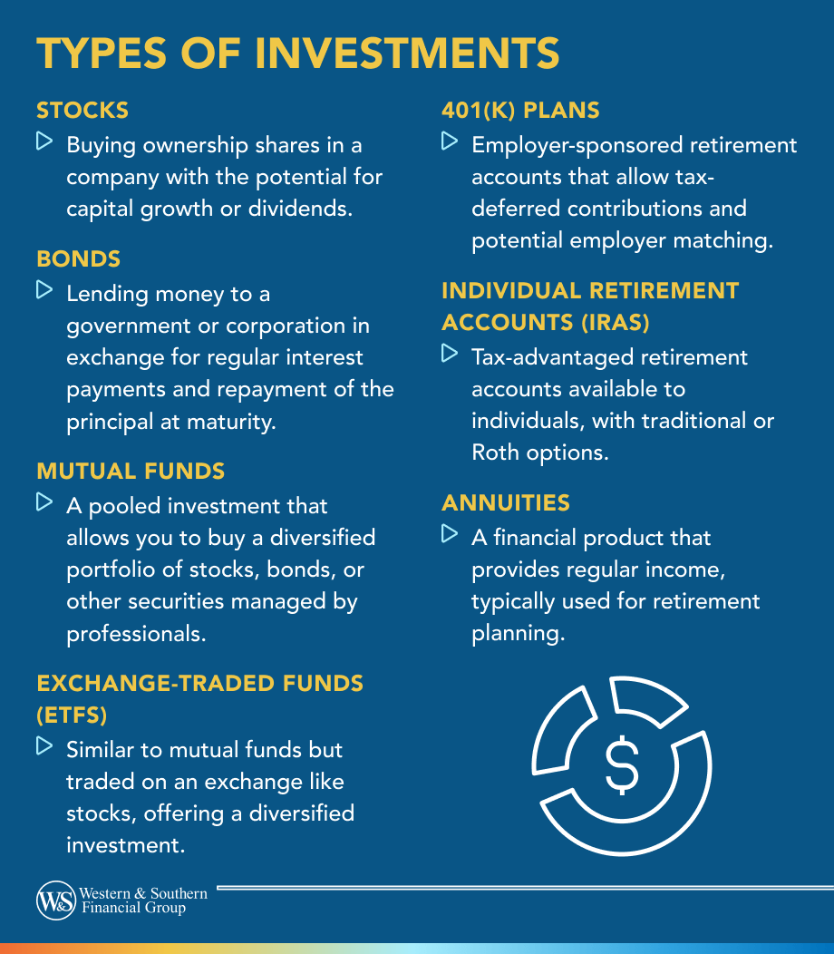 Stocks, bonds, mutual funds and ETFs are typically best suited for investors who are willing to accept market risk in exchange for long-term returns that can match or beat the rate of inflation. For this reason, these types of investments can be appropriate for long-term savings goals, such as retirement, and may be suitable for 401(k) plans and IRAs. Annuities are also worth considering, as they can provide guaranteed income after you stop working.