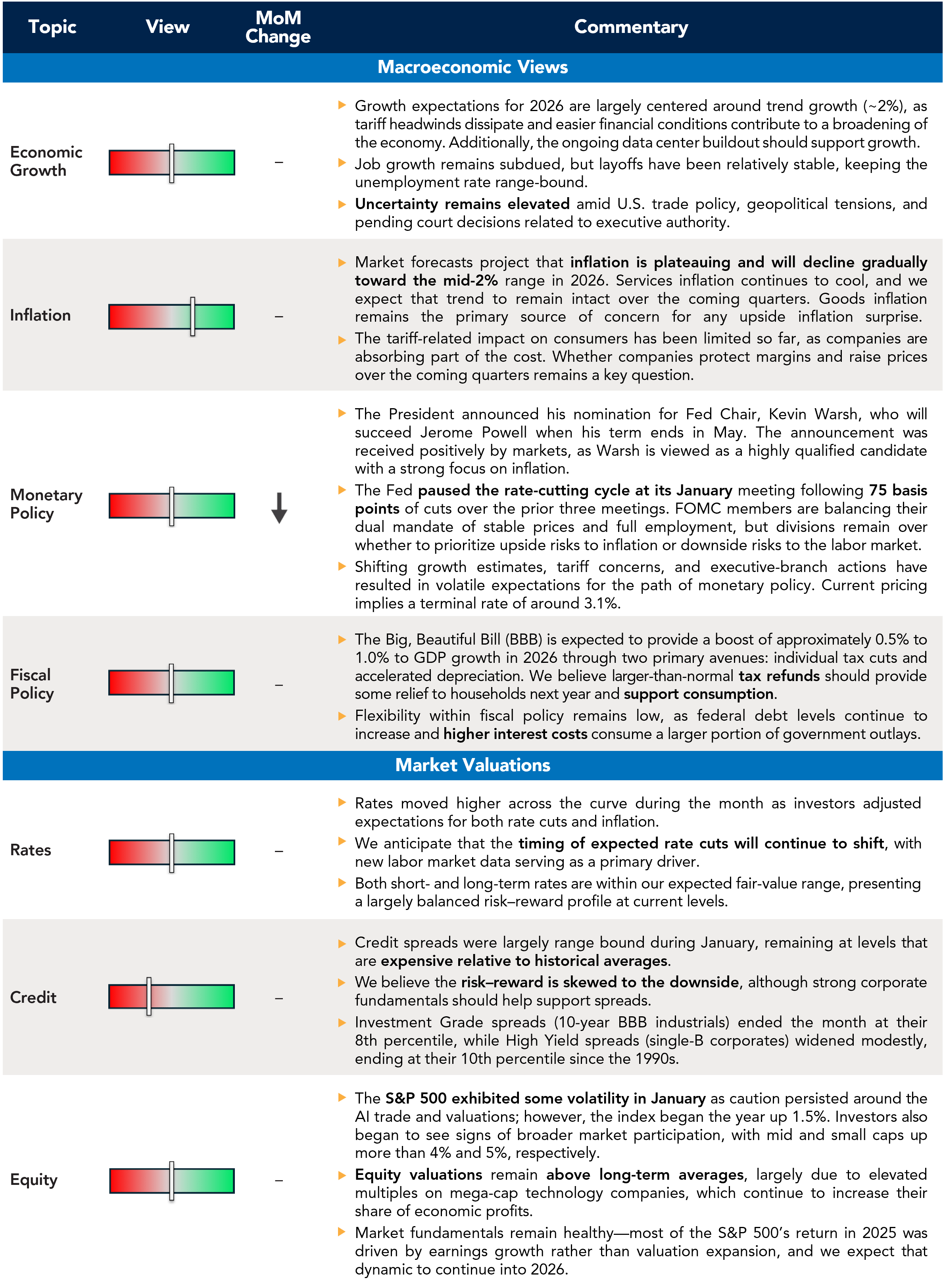 Macro and policy developments added complexity but did little to derail risk appetite. The Fed held rates steady at the January Federal Open Market Committee (FOMC) meeting, as expected, while markets continued to price a gradual easing path later in the year. Late in the month, President Trump nominated former Fed Governor Kevin Warsh as the next Chair, formally closing the succession process. While questions around central bank independence remain a topic of debate, markets treated the announcement as broadly status quo, with policy expectations largely unchanged. Political and geopolitical headlines were otherwise unusually active; however, markets largely looked through the noise, treating volatility as an opportunity rather than a signal of weakening fundamentals.