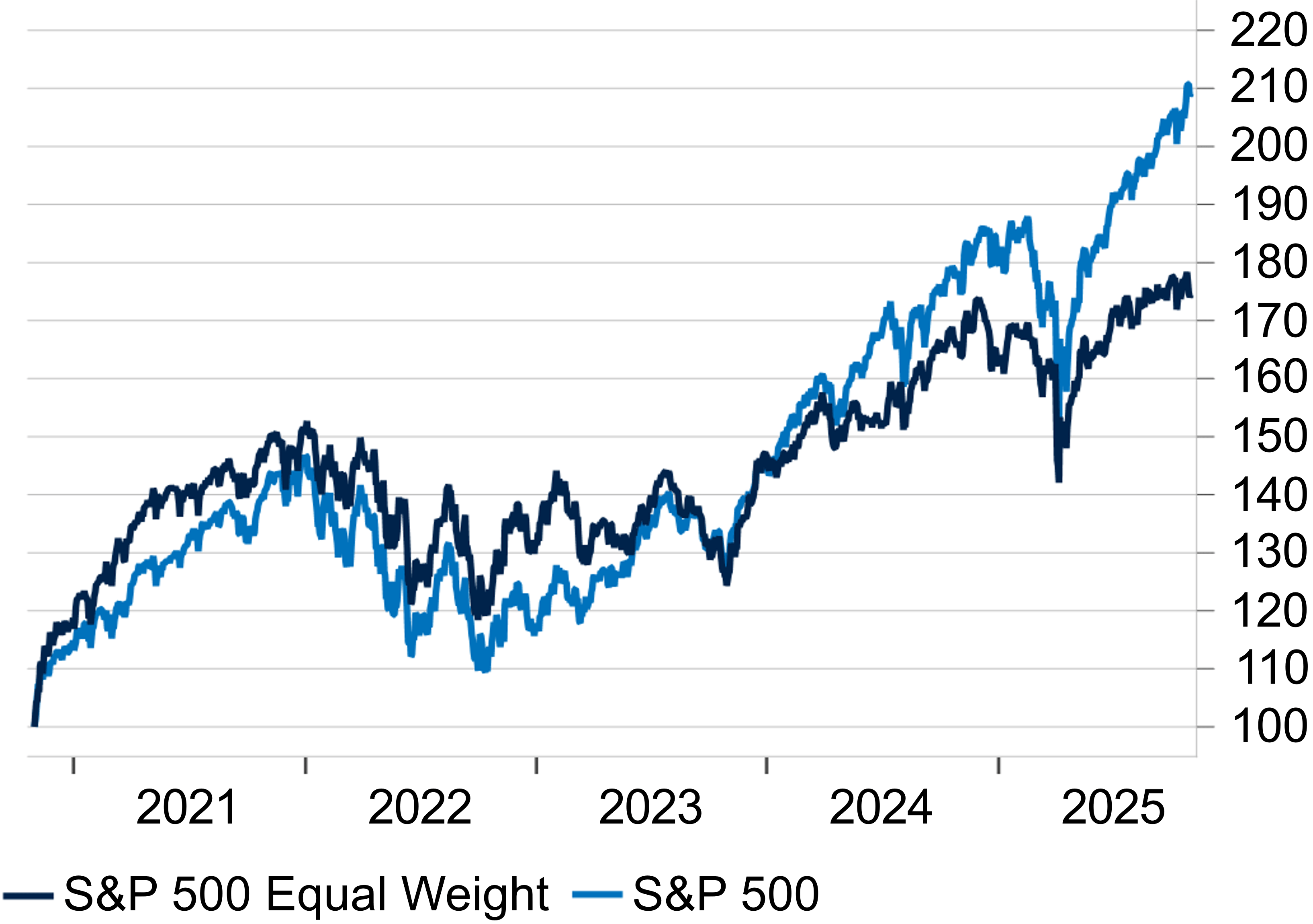 The S&P 500 market-cap-weighted index has pulled away from the equal-weight index over the past two years, reflecting the influence of mega-cap technology stocks.