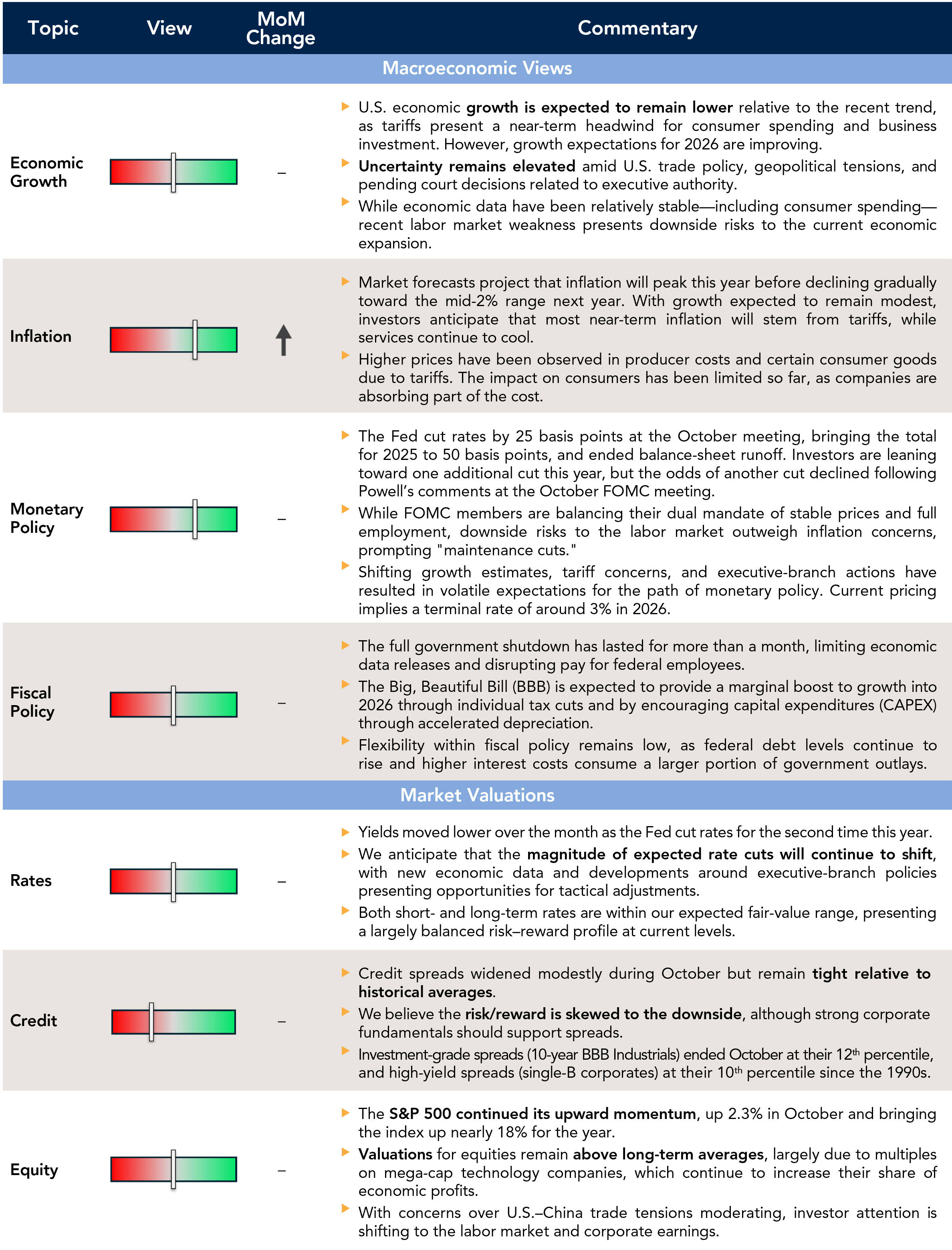 With policy easing underway, trade risks receding, and AI investment remaining robust, the market’s momentum appears intact. Yet narrow leadership, extended valuations, and softer consumer signals argue for balance. For now, we maintain a neutral stance on risk.