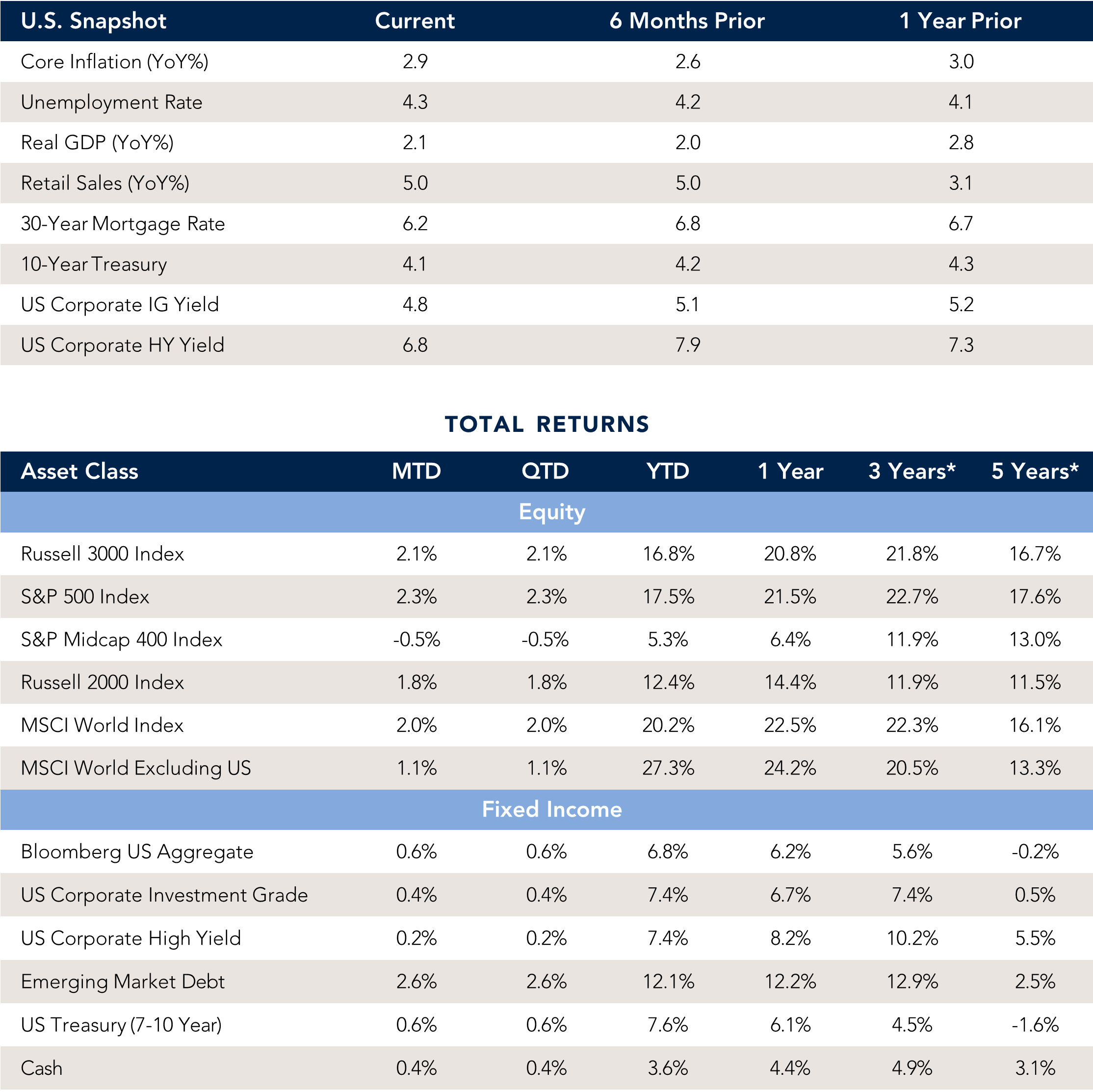 - Watching Private Credit: Recent high-profile bankruptcies have raised concerns about quality and underwriting standards within the growing private credit space. Are these isolated events? We take a closer look in this month’s Spotlight below.