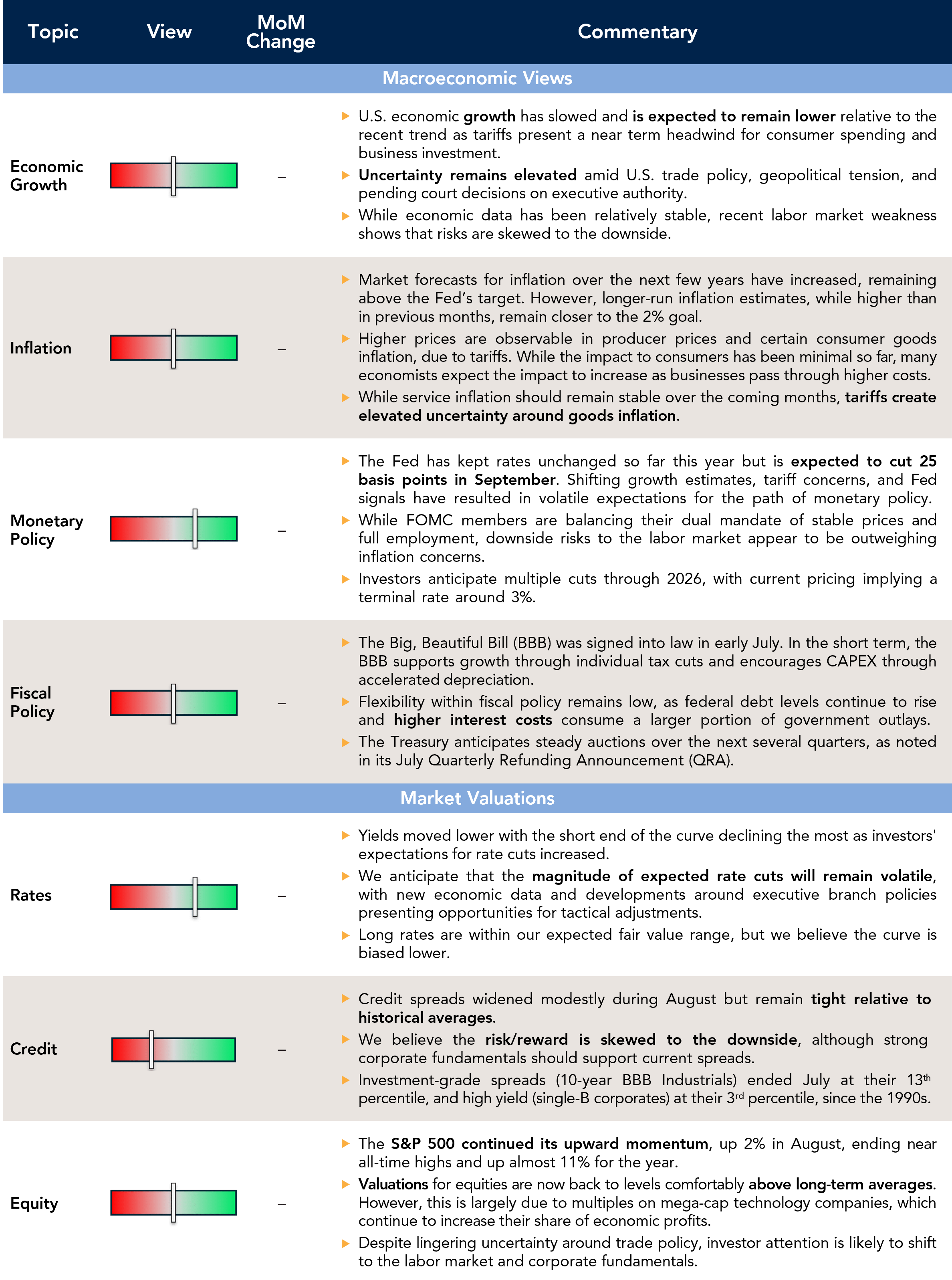 Plenty of uncertainty remains as markets debate the outlook: a softer labor picture, unresolved tariff policy and its impact on inflation and margins, the path of Fed policy, and the implications of reduced central bank independence in both the near and long term. We have maintained a largely neutral risk stance, recognizing that the underlying health of consumers and businesses continues to offset these challenges.