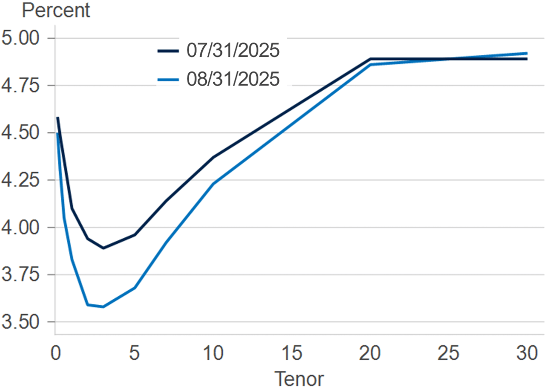 The July employment report disappointed, with an even bigger surprise coming from the materially negative revisions to May and June. The debate now focuses on whether job growth is structurally slowing—posing risks to the current expansion—or whether the past few months reflect only a temporary soft patch linked to tariff uncertainty, now likely to improve as conditions become clearer. We lean toward the latter view, though the ADP jobs release and the official payroll report later this week will provide important signals for market sentiment. Powell’s Jackson Hole speech emphasized that tariffs now present a more balanced set of risks—downside risks to growth and employment offset by upside risks to inflation—implying that policy should shift closer to neutral from its current restrictive stance. Markets responded with a 32-basis-point drop in 2-year Treasury yields, a steepening of the curve, and a 2.2% decline in the U.S. dollar.