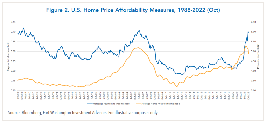 Two measures of affordability – mortgage payment to income (orange line) and average home price to income (blue line) are at their highest levels since the mid-2000s (see chart below). The impact is already apparent in new home sales, which have fallen for nine consecutive months --about 40% below their peak in 2020.