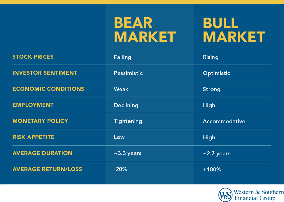 - Falling stock prices, negative investor sentiment, and economic slowdown mark a bear market.