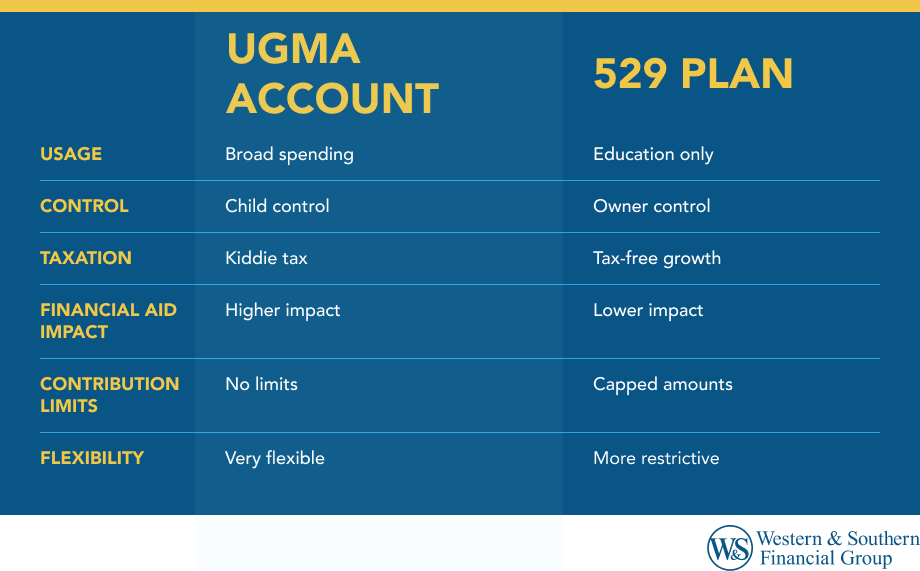 - UGMA is a child-owned asset and may impact financial aid more than a 529 plan, which is considered a parent asset.