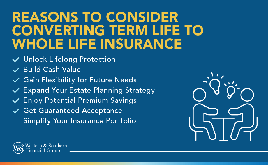 Your financial situation and needs likely will change over time. So while term insurance might once have been a good fit, permanent whole life insurance may later become a more appealing option. Here are some reasons why a life insurance conversion may make sense: