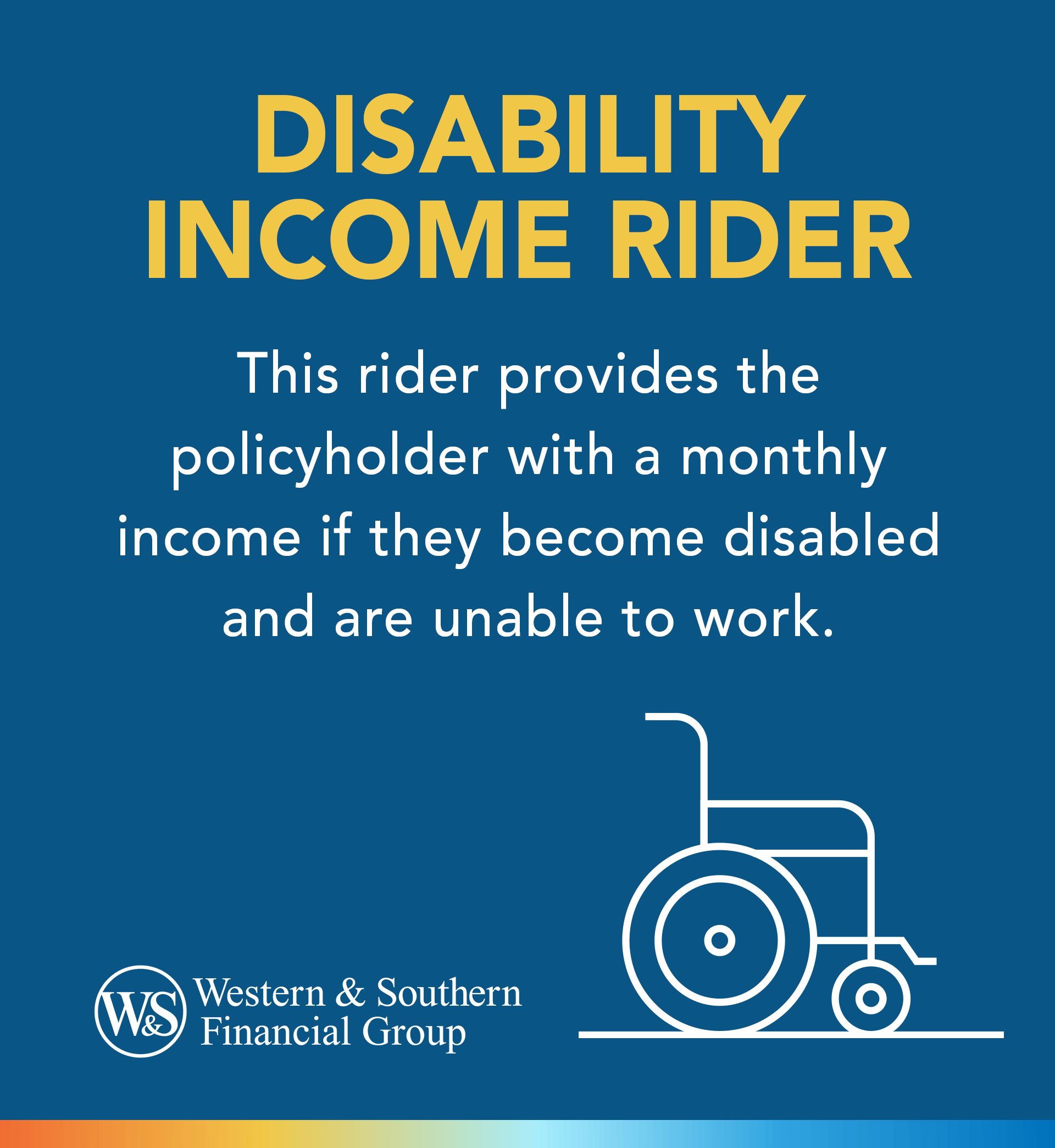 - A Disability Income Rider is an optional provision in life insurance that offers a monthly income benefit if the insured becomes disabled.