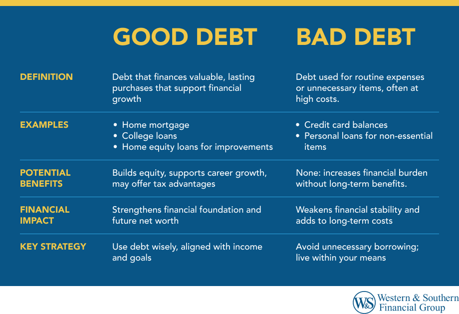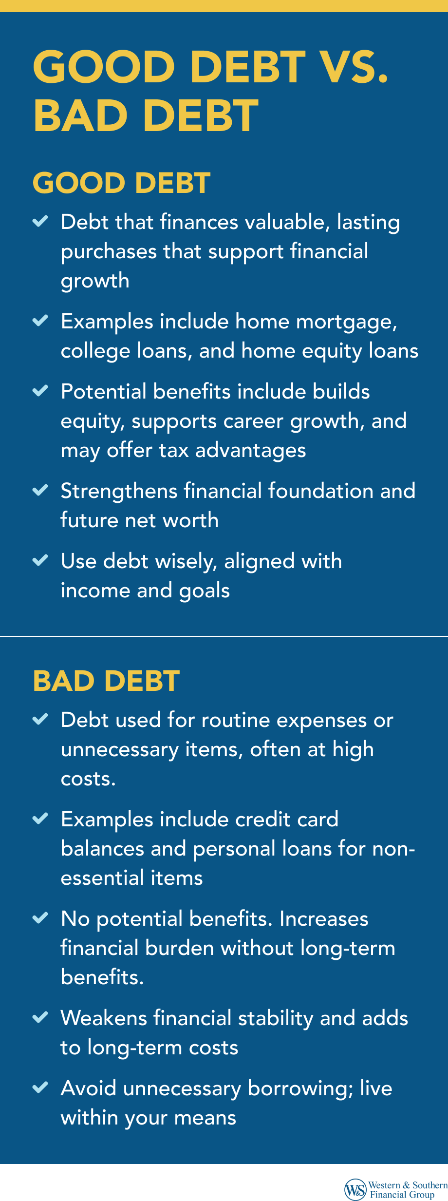 Bad debt, in contrast, is borrowing to pay your routine living expenses without collateral, and paying a very high interest rate at that. Let's take a closer look at these two kinds of debt, and how to strike a balance between them.