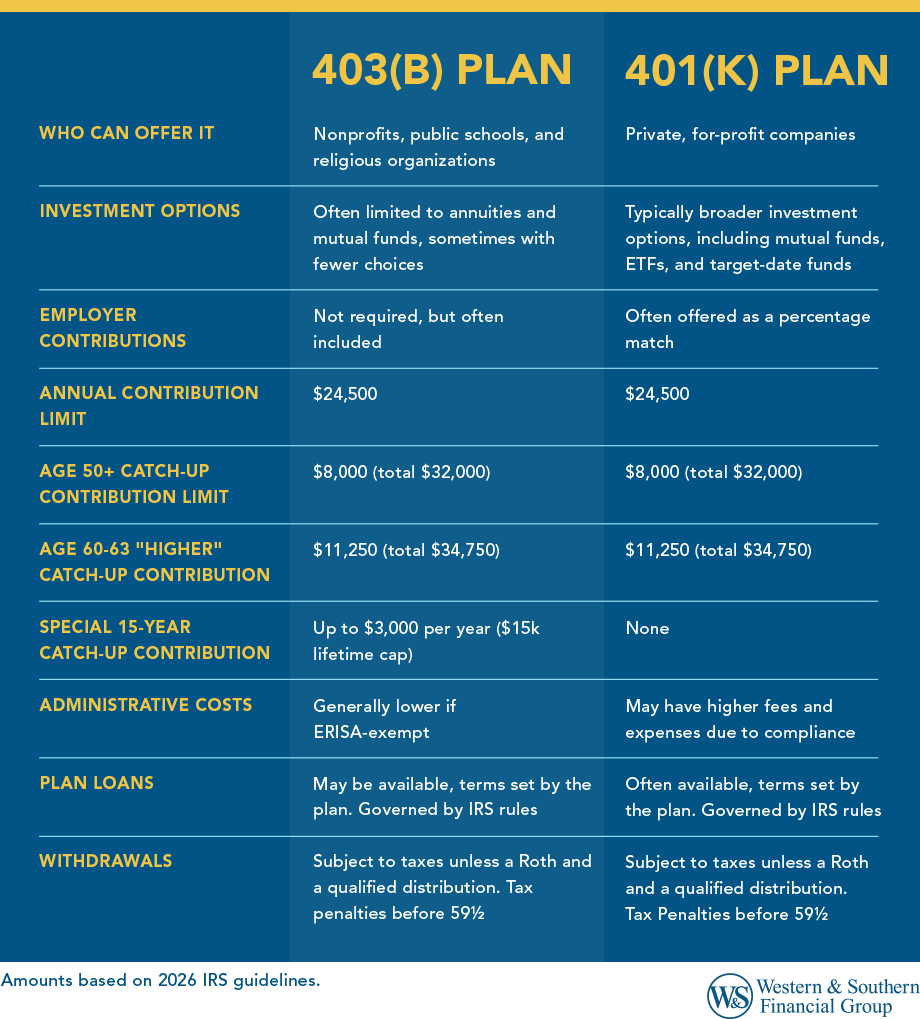 - 403(b) plans are offered by nonprofits and schools, while 401(k)s are for private-sector employees.