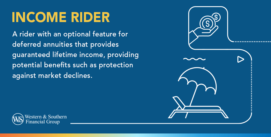 An income rider is an optional feature available with deferred annuities. It provides guaranteed income for the rest of your life, starting at a specified age, sometimes as early as 60. Some riders also include a growing benefit base, which the insurance company uses to calculate future income payments.