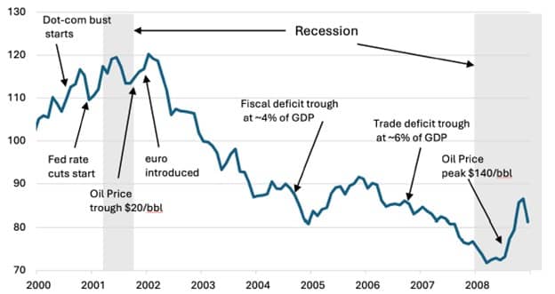 - Emerging market boom: China’s rapid industrialization lifted commodity prices and drove emerging market strength, contributing to a rotation away from the dollar. No comparable dynamic exists today, with China facing structural headwinds and significant tariffs.