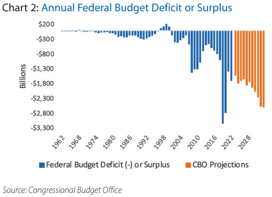 To wit the Federal government has run a budget deficit in each of the last 22 fiscal years (FY). The last time the Federal budget was in surplus was 2001 (Chart 2). This period includes both the Great Recession and the Global Pandemic when the Federal government would have been expected and encouraged to engage in deficit spending to support the economy. It is during better times that fiscal discipline is required to ensure the ability to borrow when it is most needed.