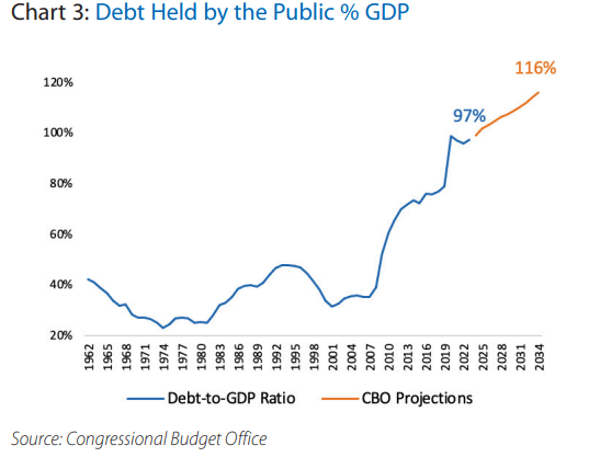 According to the CBO, it is expected that the debt-to-GDP ratio, currently at 97% (again using debt held by the public), is expected to rise to 116% by 2034 (Chart 3) and 172% by 2054. Note that the CBO forecast is based on current law and assumptions about growth, inflation, and interest rates. That means they can change significantly for the better or the worse as conditions change.