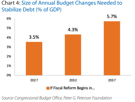Using analysis from the Peter G. Peterson Foundation and CBO estimates, if fiscal reform were to begin in 2027 the cost, in terms of the size of annual budget change needed to stabilize the debt as a percent of GDP in the long term would be 3.5% (Chart 4). This means that the annual budget deficit would need to be reduced by 3.5% of GDP, and then held at that rate in ensuing years. A painfully big number but not impossible. If they wait until 2032 then the size of the budget change needed rises to 4.3%. The longer they wait the greater the size of the needed adjustment.