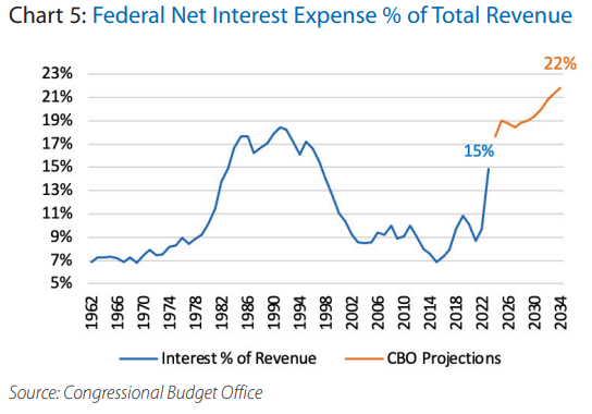 Federal net interest expense as a percentage of total tax revenues has been climbing quickly and at 15% is at its highest since the mid-1990s. This ratio is expected to continue to rise in the coming years, potentially crowding out discretionary spending and making it increasingly difficult for Congress. In fact, CBO projections suggest the ratio will rise to 22% by 2034 (Chart 5).