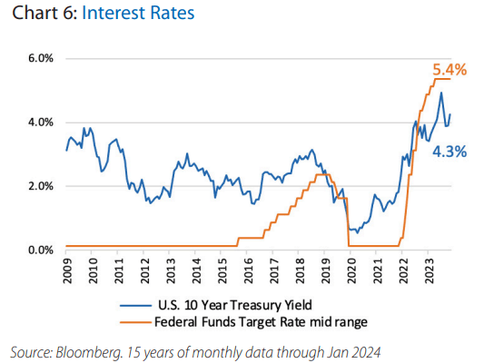 Progress on the policy front is needed for many of the reasons already cited. But also, because the current debt trajectory raises the likelihood that longer-term interest rates remain higher than they otherwise might. Treasury investors may demand a premium for continuing to fund runaway government deficits and, as the required increase in Treasury debt issuance forces competition for investor dollars across the capital markets. While the Fed’s tightening campaign to combat inflation certainly resulted in higher yields (Chart 6), investors must remain vigilant to the possibility that those yields could remain higher for longer with ongoing budget battles and fiscal issues.