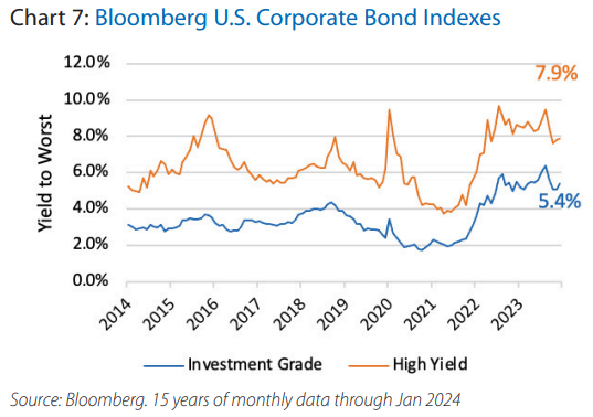 That said we expect that a soft landing for the economy and moderating inflation will be supportive of both equities and fixed income generally. We are attracted to current corporate bonds as their yields become more appealing as the rate of inflation falls (Chart 7).