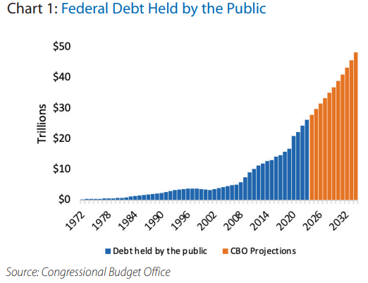 At fiscal yearend 2023, the Federal debt held by the public was $26 trillion and it is still growing. According to recent projections published by the Congressional Budget Office (CBO), the Federal debt burden is expected to increase by $22 trillion in the next 10 years (Chart 1). And we believe this forecast may be understating the growth over that time. We question whether this trajectory can be sustained without consequences.